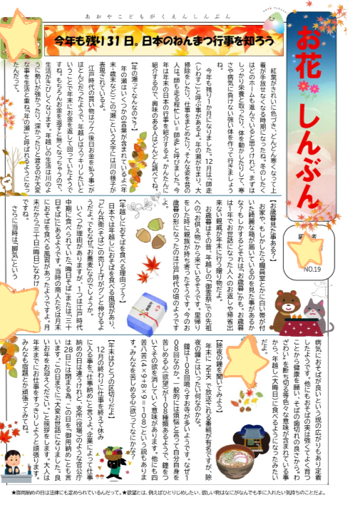 青谷こども学園では、職員が園内広報誌”お花新聞”を発行しています。学園や学校の行事の紹介や、季節に合わせた豆知識などなど…