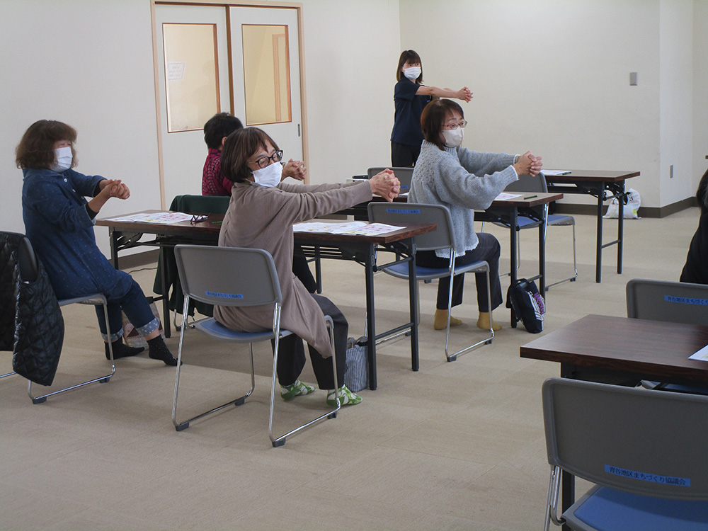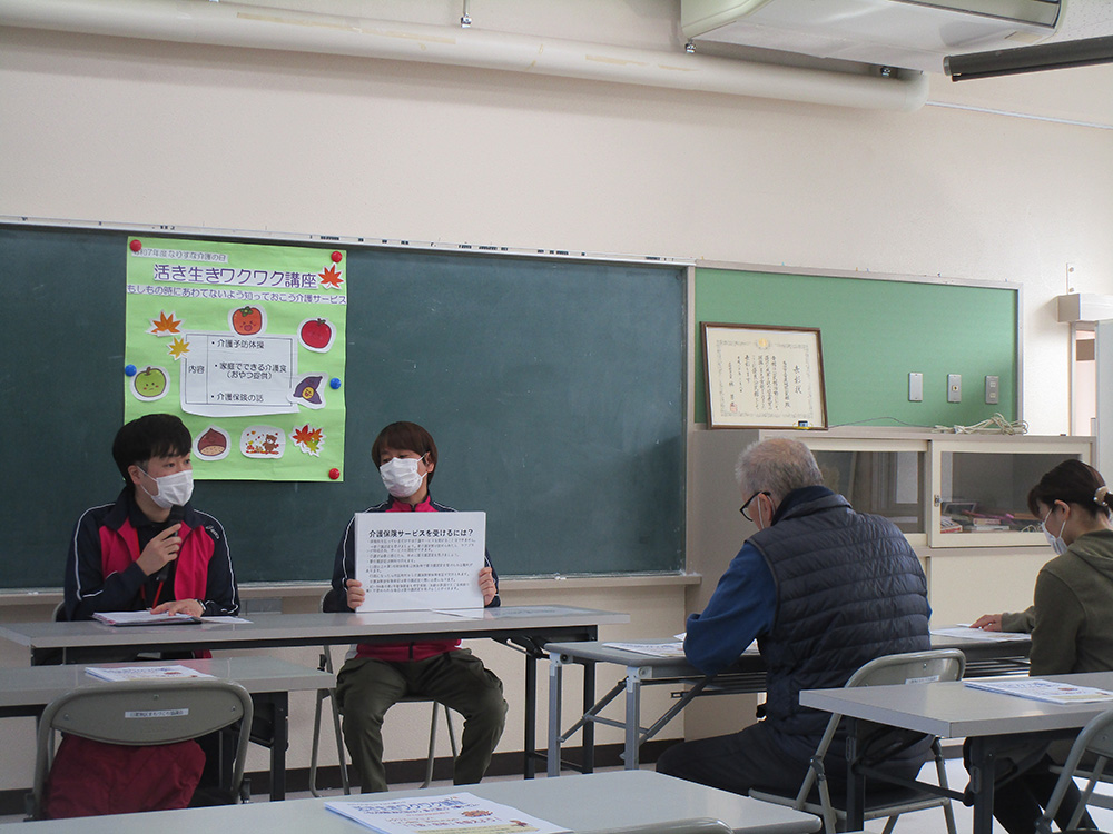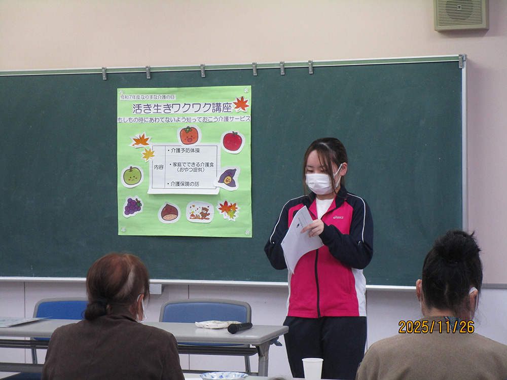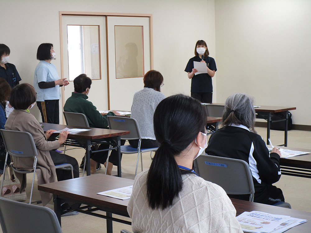 今年は「活き生きワクワク講座 ~もしもの時にあわてないよう 知っておこう 介護サービス~」というタイトルで介護サービスについての話や体操、介護おやつの提供を行いました。