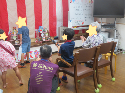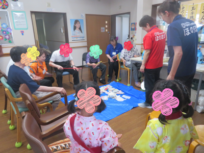 おじいちゃん、おばあちゃんといろいろなゲームや遊びをさせていただきました。射的で当たったら、おばあちゃんが拍手してくださり、こどもたちは、嬉し恥ずかしといった様子でした😊