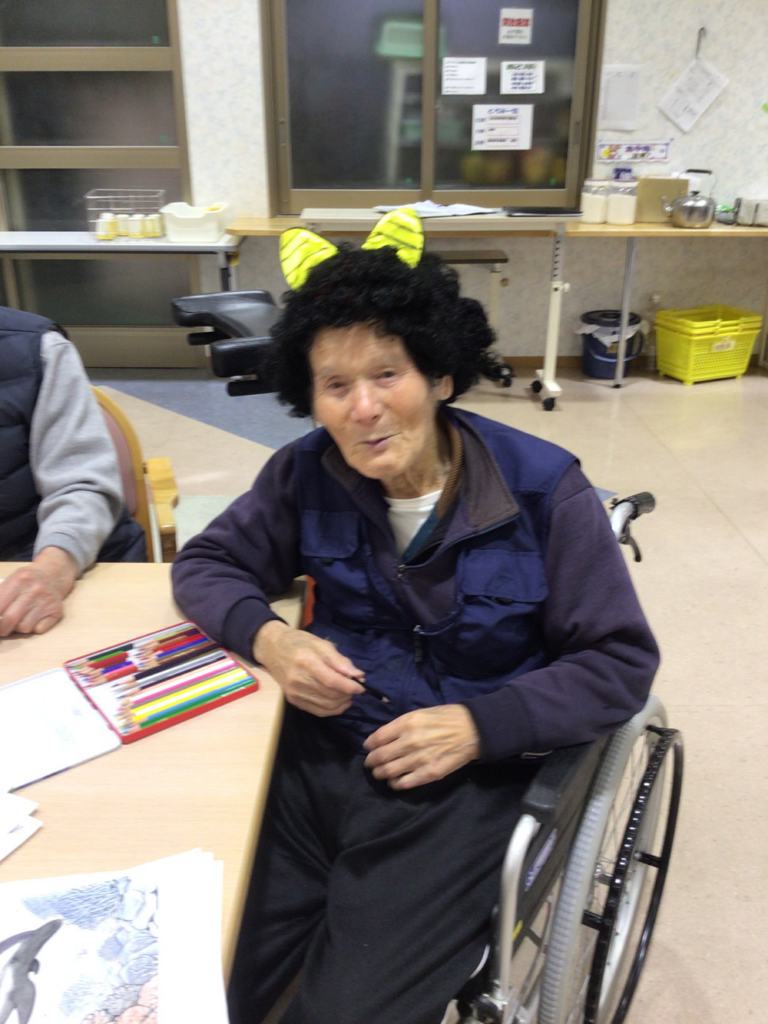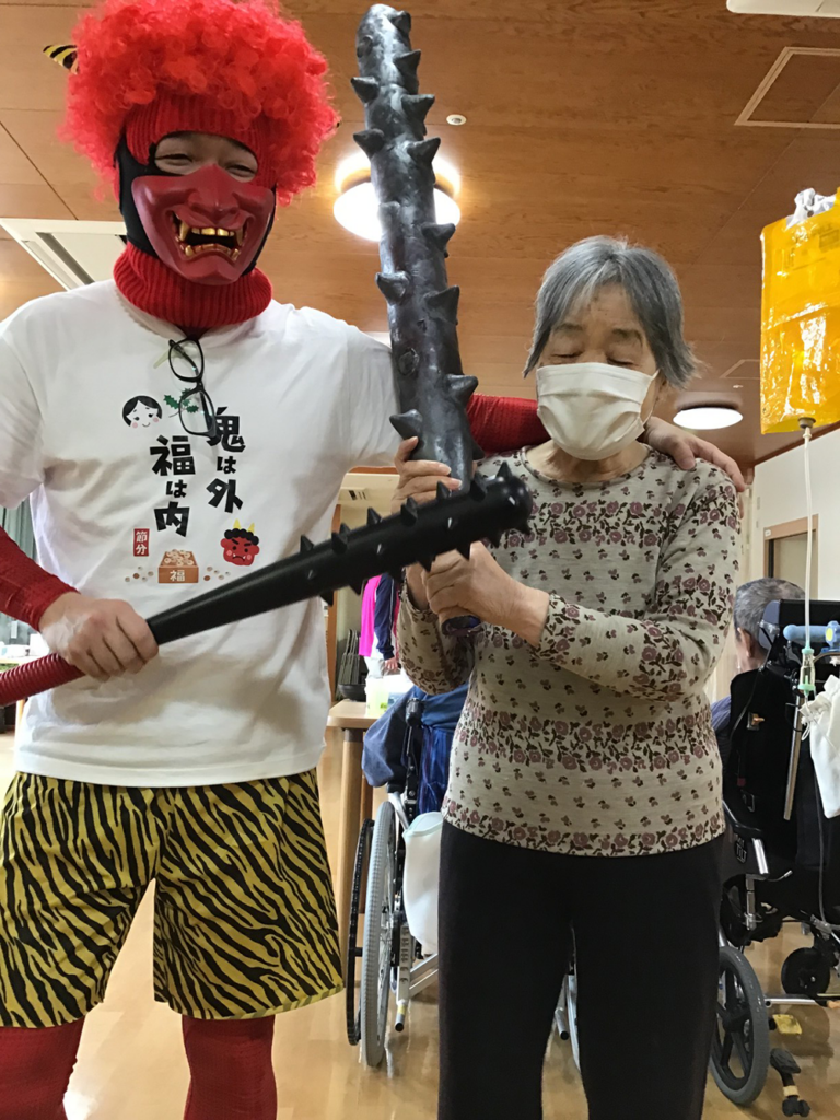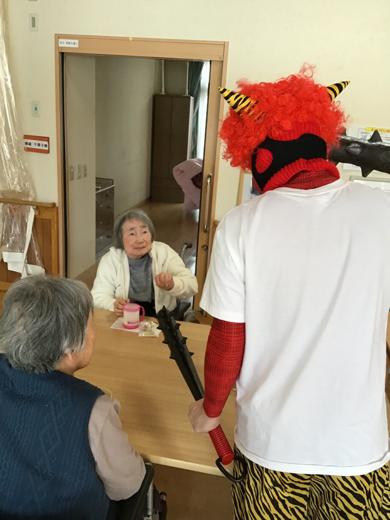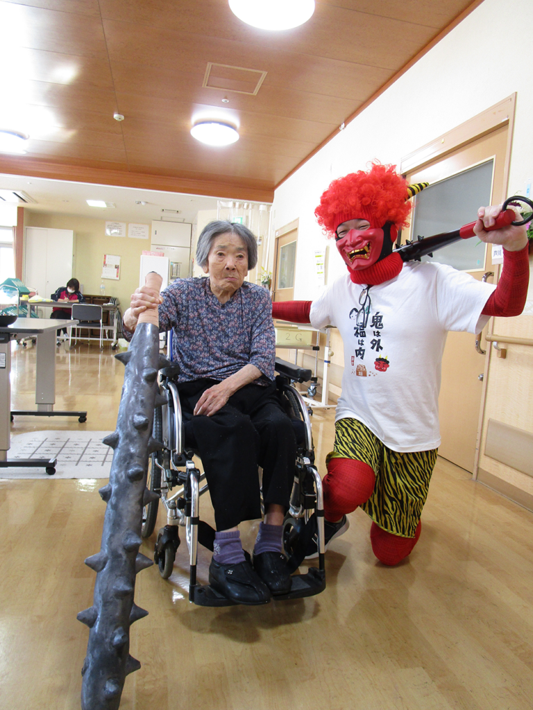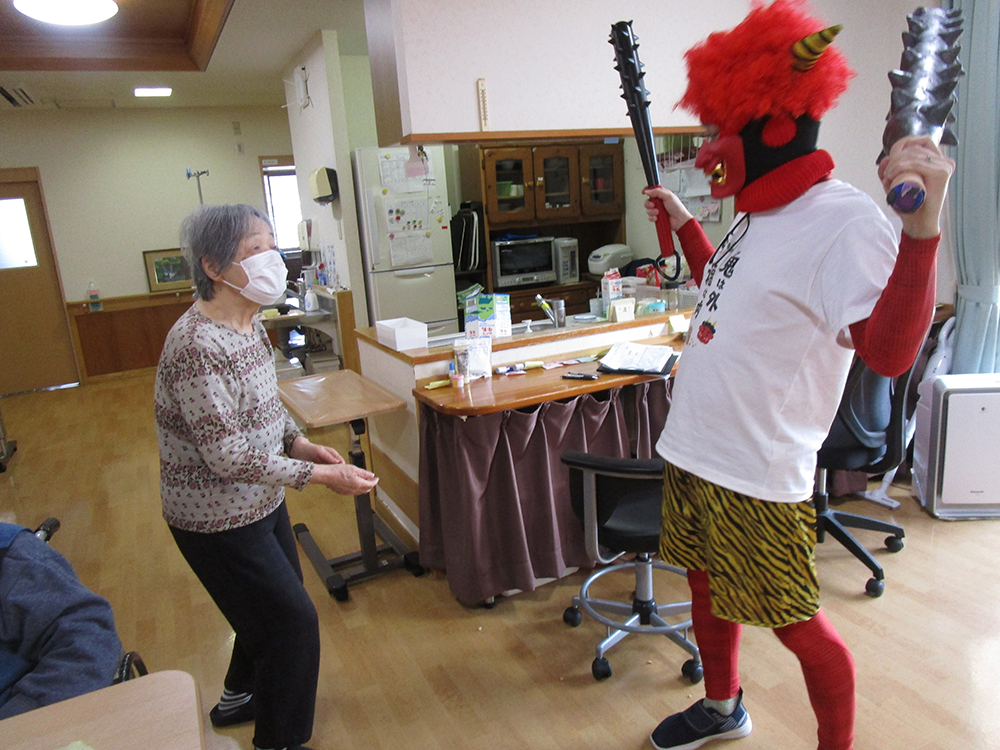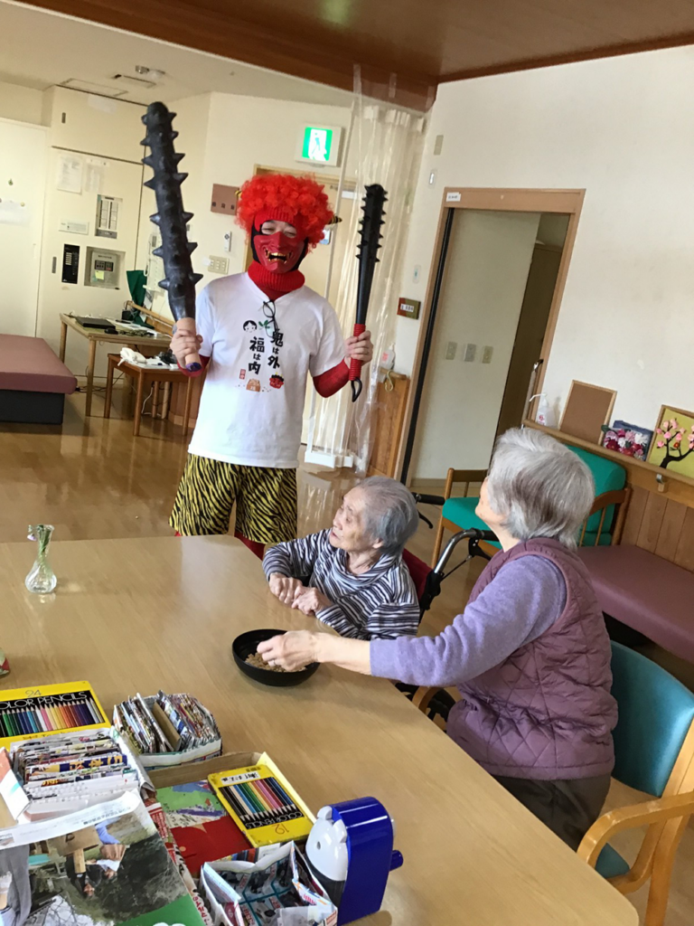 2月3日は節分。なりすなでは2月4日に実施しました。普段は優しい職員が赤鬼に変身!その鬼に向かって「鬼は外!福は内」と大きな声で豆をつかんで投げていました。発声、手の運動に持ってこいでした。最後は仲良く写真撮影。これで邪気を追い払う事ができました。