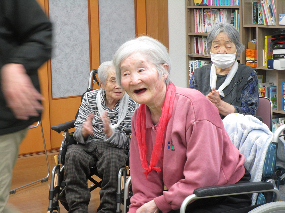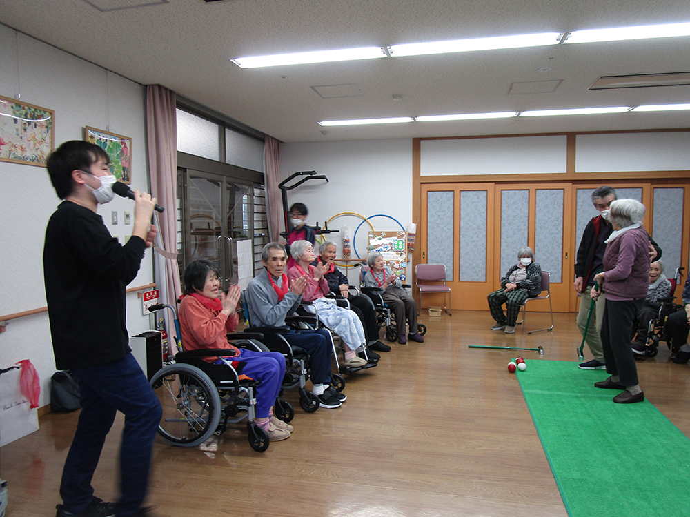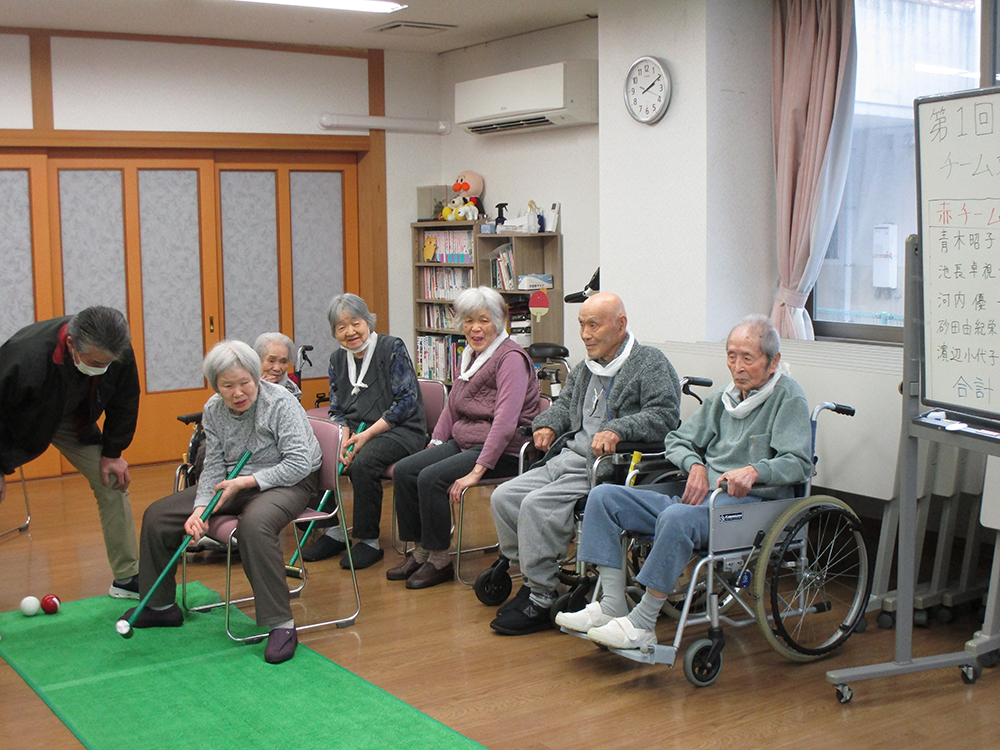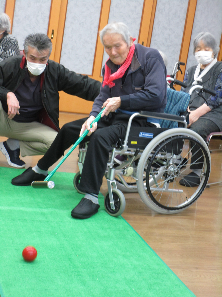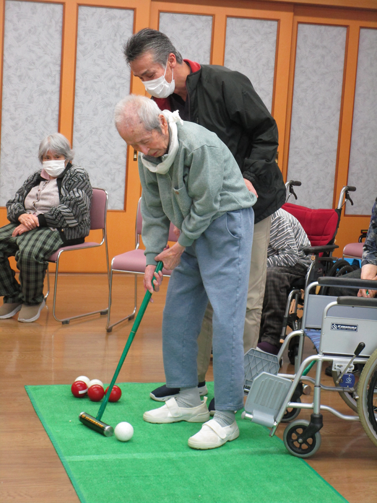 普段なら立ち上がるのもやっとの方もスッと立ち上がり、集中した表情でボールを打つ姿は若返った様子に見えました。
